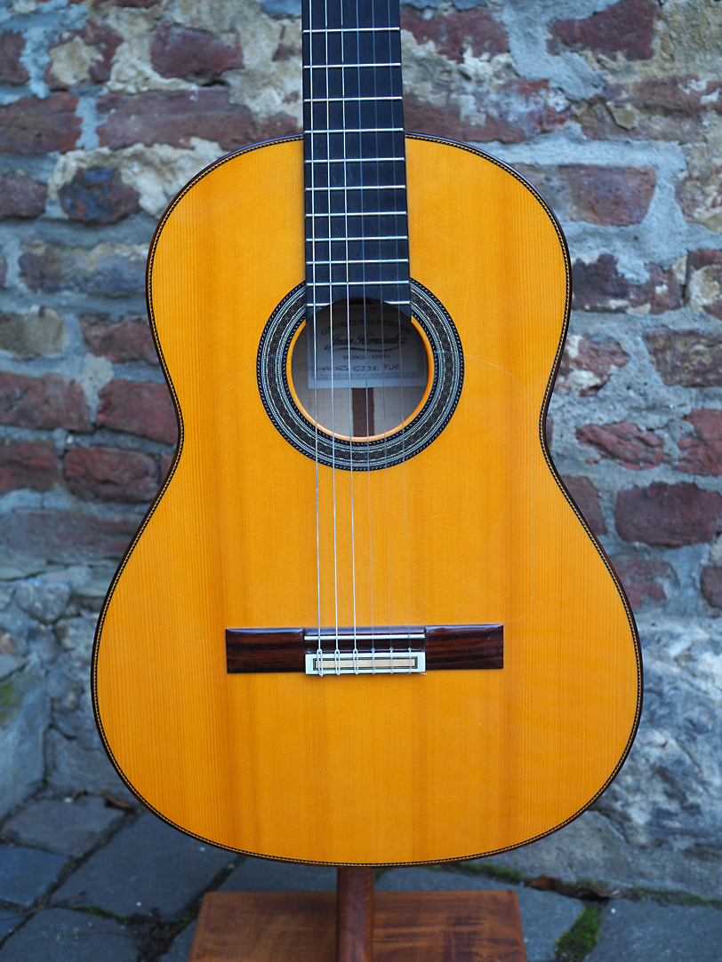 vollmassiv, Fichtendecke, Ahornkorpus, 650 mm Mensur, 51 mm Sattelbreite, Schlagbrett, Hochglanz-Finish.