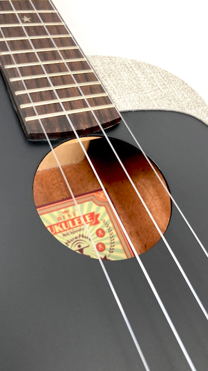 aNueNue kombiniert die schwarze Decke der Black Beauty mit einer Brücke und einem Griffbrett aus Palisander, die Kopfplatte ist ebenfalls schwarz lackiert. Die Decke ist verziert mit einer Art "Pickguard" aus Stoff. Das sieht nicht nur gut aus, sondern schützt die matt lackierte Decke wunderbar vor Spielspuren, die beim Strumming unweigerlich entstehen würden.